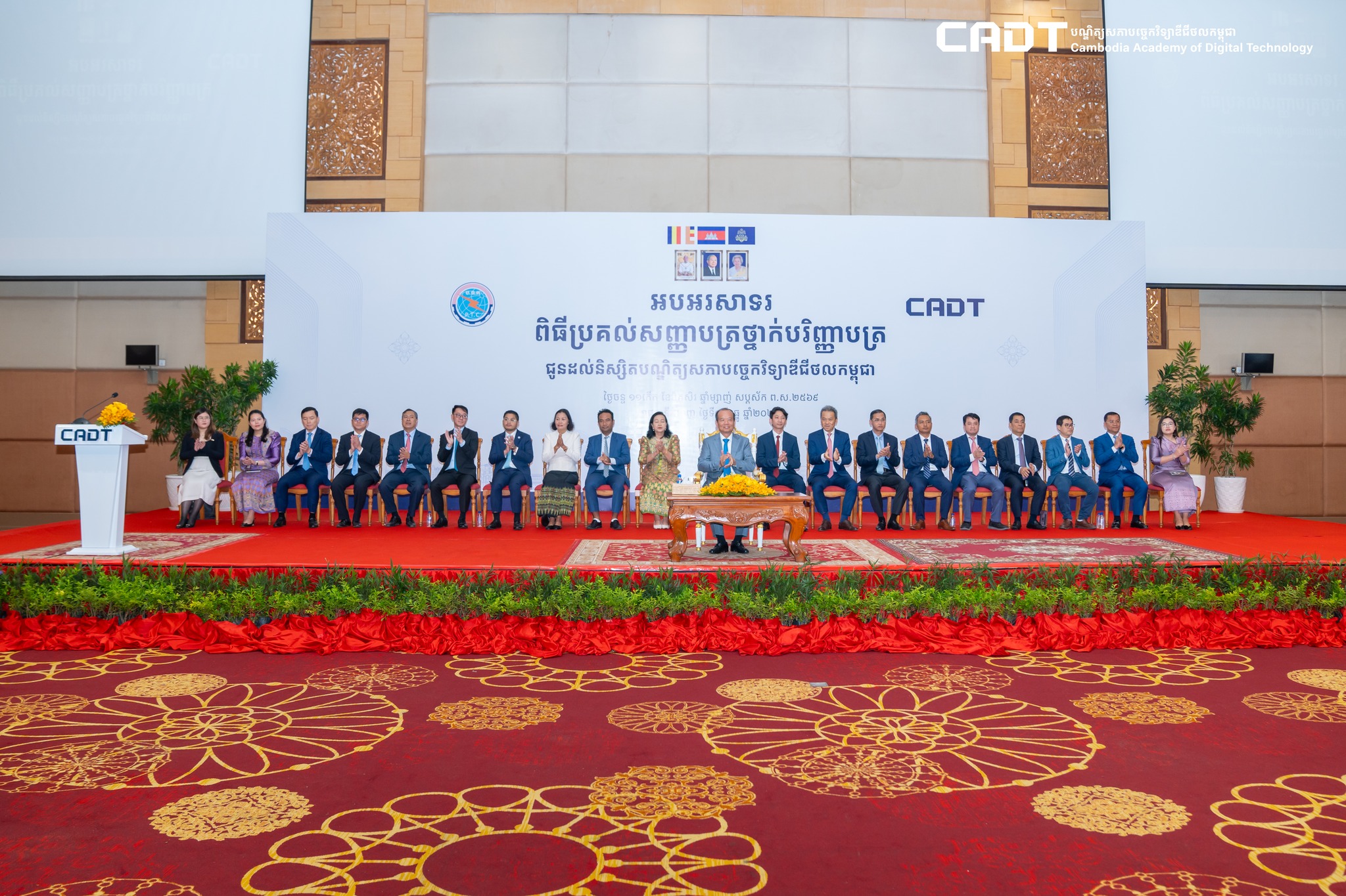 On the morning of December 1, 2025, at the Sokha Phnom Penh Hotel, CADT organized a Graduation Ceremony for 242 successful students who completed their studies in CADT Generation 7 (2024) and Generation 8 (2025). The event was presided over by H.E. Dr. Chea Vandeth, Minister of Post and Telecommunications. The ceremony was attended by esteemed leaders, professors, representatives of development partners, and guardians.